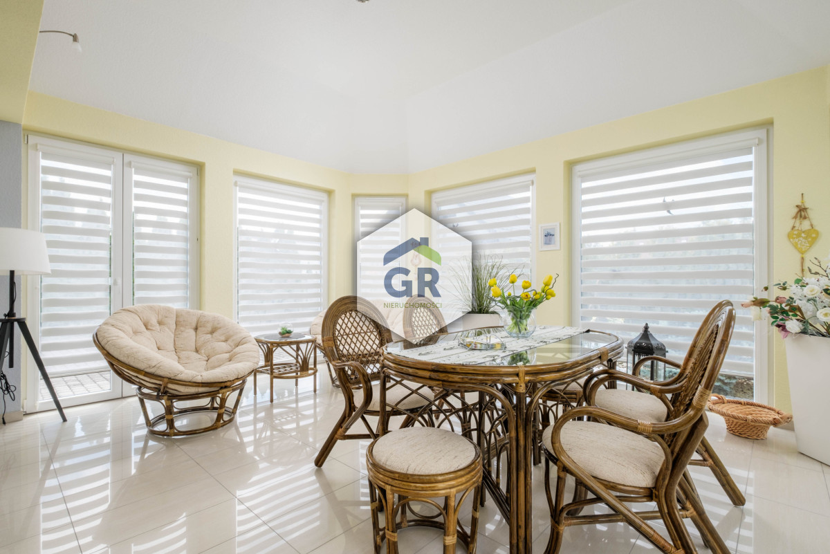 Dużym atutem parteru jest ogród zimowy (22,09 m2), który został zaadaptowany z tarasu. Pomieszczenie dzięki wysokim witrynom jest doskonale doświetlone. Z ogrodu zimowego poprzez drzwi tarasowe wychodzimy na ogród, który jest bardzo zadbany, a roślinność została w nim zaaranżowana w przemyślany sposób, tak aby zachować pełną prywatność. W ogrodzie przewidziano miejsce wypoczynku, znajduje się w nim również drewniana altana oraz drewniany budynek gospodarczy.