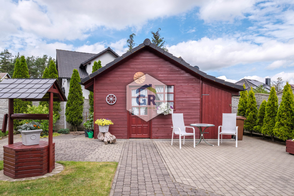 Dużym atutem parteru jest ogród zimowy (22,09 m2), który został zaadaptowany z tarasu. Pomieszczenie dzięki wysokim witrynom jest doskonale doświetlone. Z ogrodu zimowego poprzez drzwi tarasowe wychodzimy na ogród, który jest bardzo zadbany, a roślinność została w nim zaaranżowana w przemyślany sposób, tak aby zachować pełną prywatność. W ogrodzie przewidziano miejsce wypoczynku, znajduje się w nim również drewniana altana oraz drewniany budynek gospodarczy.