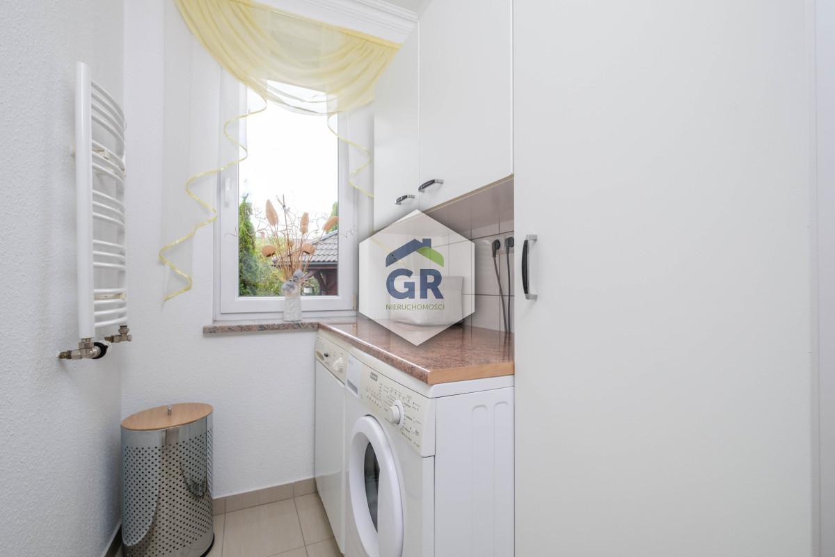 2 i 15,95 m2), kotłownia (14,85 m2), pralnia (3,56 m2). Dodatkowo jednostanowiskowy garaż (27,15 m2) z bramą na pilota wbudowany w bryłę domu. W salonie znajduje się kominek. Kuchnia została wyposażona w stałą zabudowę wyposażoną w niezbędne sprzęty AGD, m.in: lodówka, piekarnik oraz płyta indukcyjna.