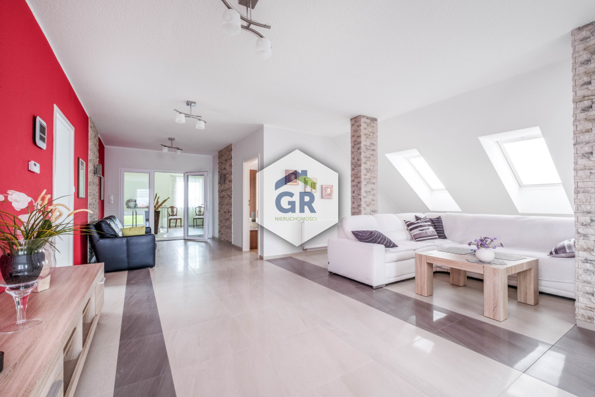 Na poddaszu znajduje się przestronny salon z aneksem kuchennym (57,79 m2), sypialnia (13,31 m2), pokój (5,72 m2) i gabinet (4,08 m2), łazienka (7,37 m2).