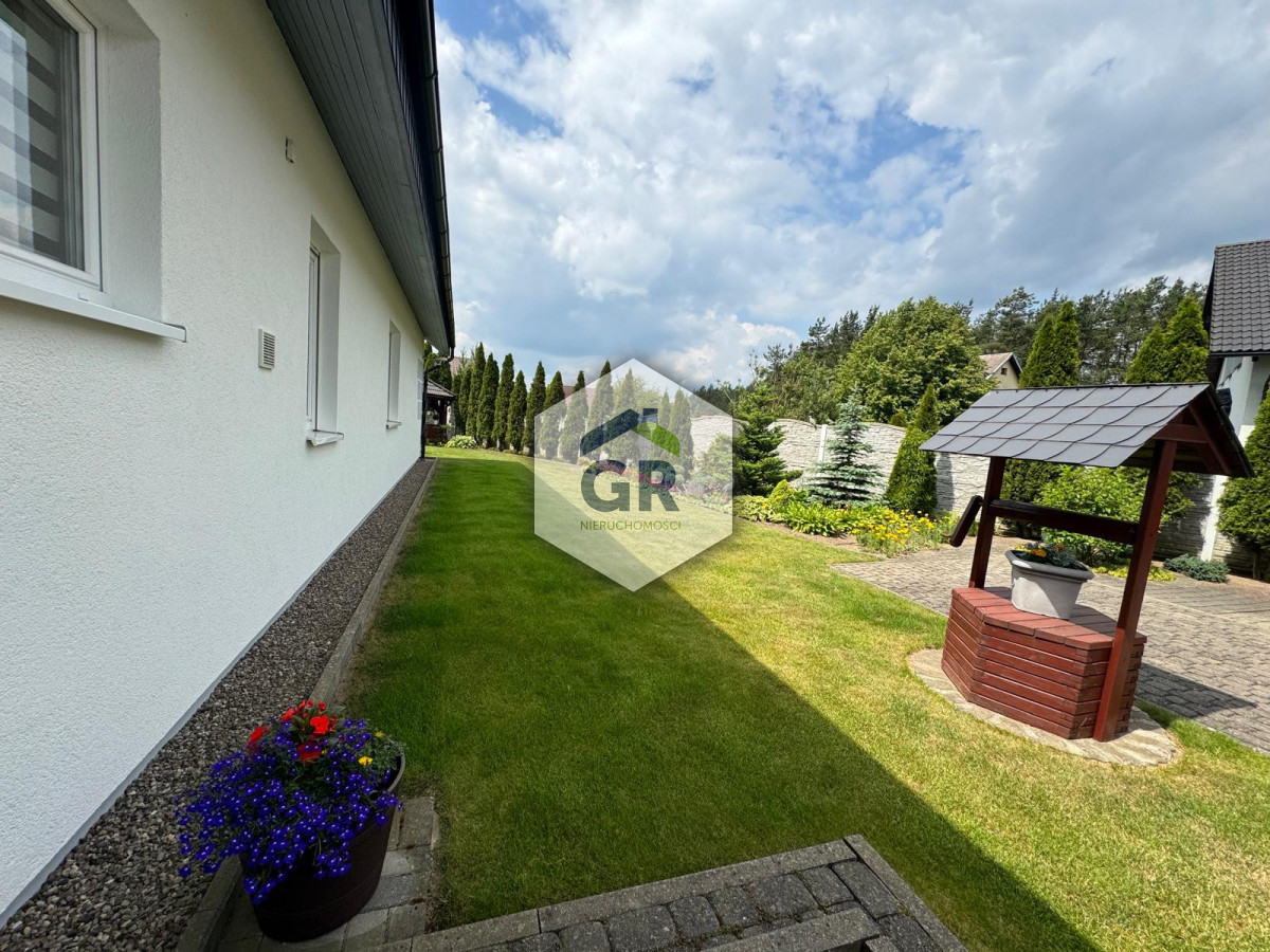 Z ogrodu zimowego prowadzi wyjście do pięknie zagospodarowanego ogrodu, który zapewnia pełną prywatność. Na terenie posesji znajduje się drewniana altana oraz budynek gospodarczy.
