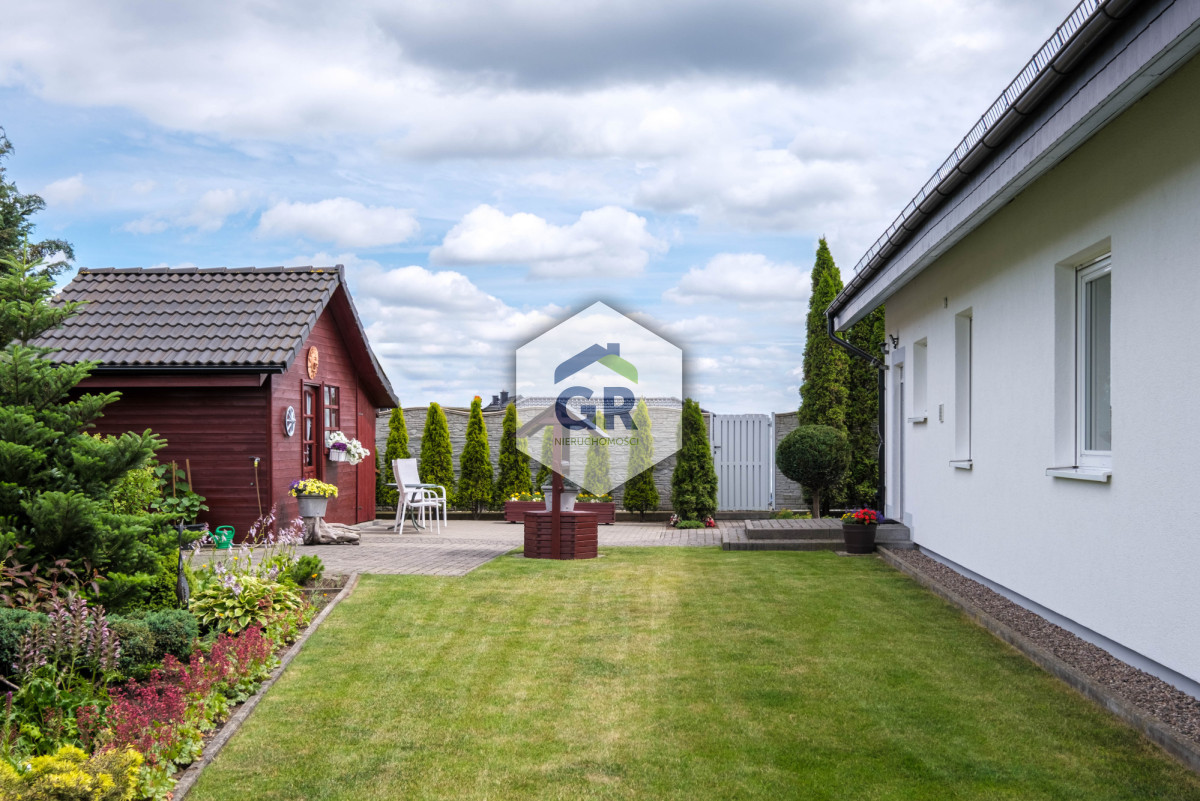 Z ogrodu zimowego prowadzi wyjście do pięknie zagospodarowanego ogrodu, który zapewnia pełną prywatność. Na terenie posesji znajduje się drewniana altana oraz budynek gospodarczy.