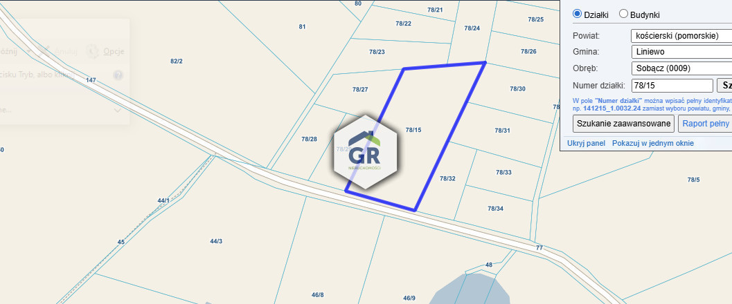 Dane geodezyjne: 78/15; obręb 09; Sobącz