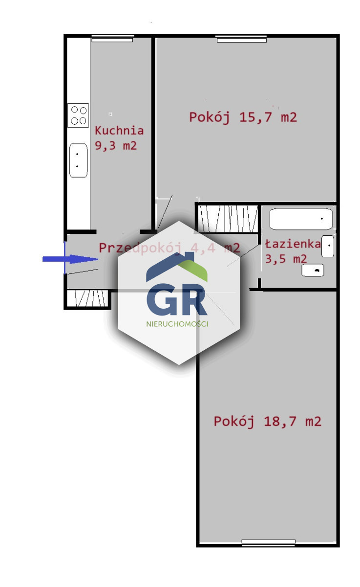- dwóch pokoi (18,7 i 15,7 m2),